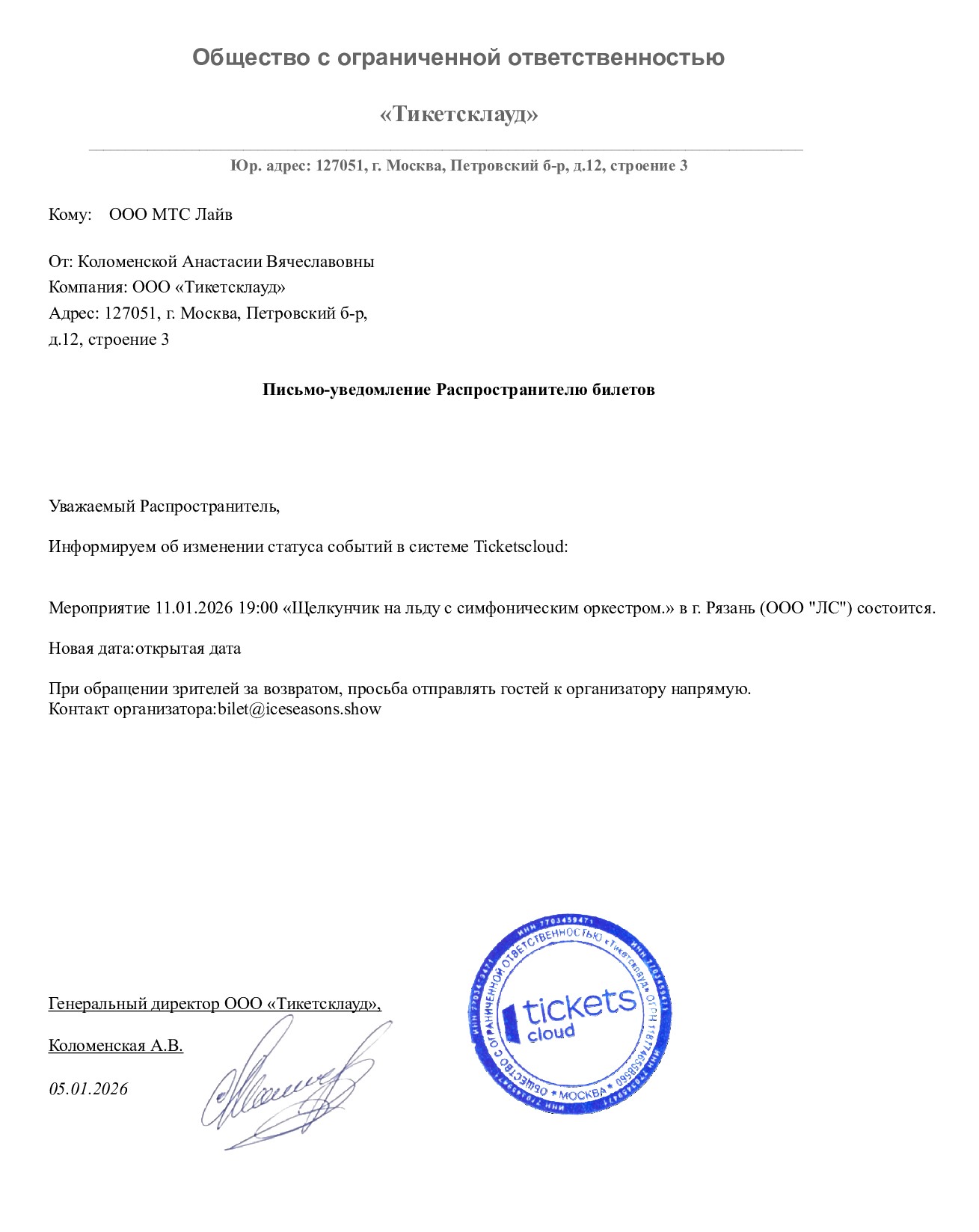 Уважаемый клиент! Спешим сообщить, что по информации, полученной от организатора, спектакль «Щелкунчик на льду с симфоническим оркестром», запланированный на 11 января 2026 года в 15:00 на площадке ДС «Олимпийский», перенесён на открытую дату. Новая дата спектакля будет объявлена дополнительно. Ранее приобретенные билеты действительны, обменивать их не нужно. По вопросам возврата билетов обращайтесь, пожалуйста, к организатору спектакля по электронной почте: bilet@iceseasons.show С уважением, команда поддержки Ticketland.