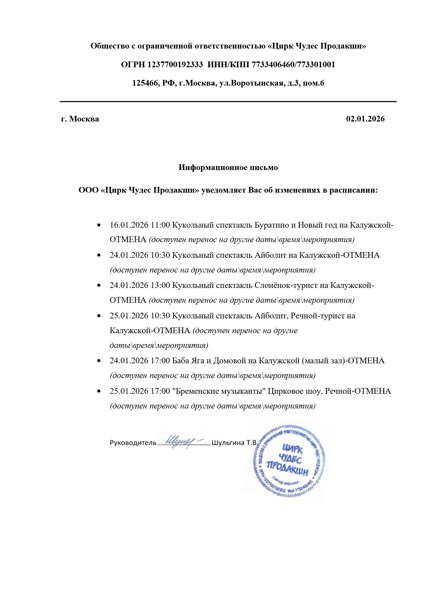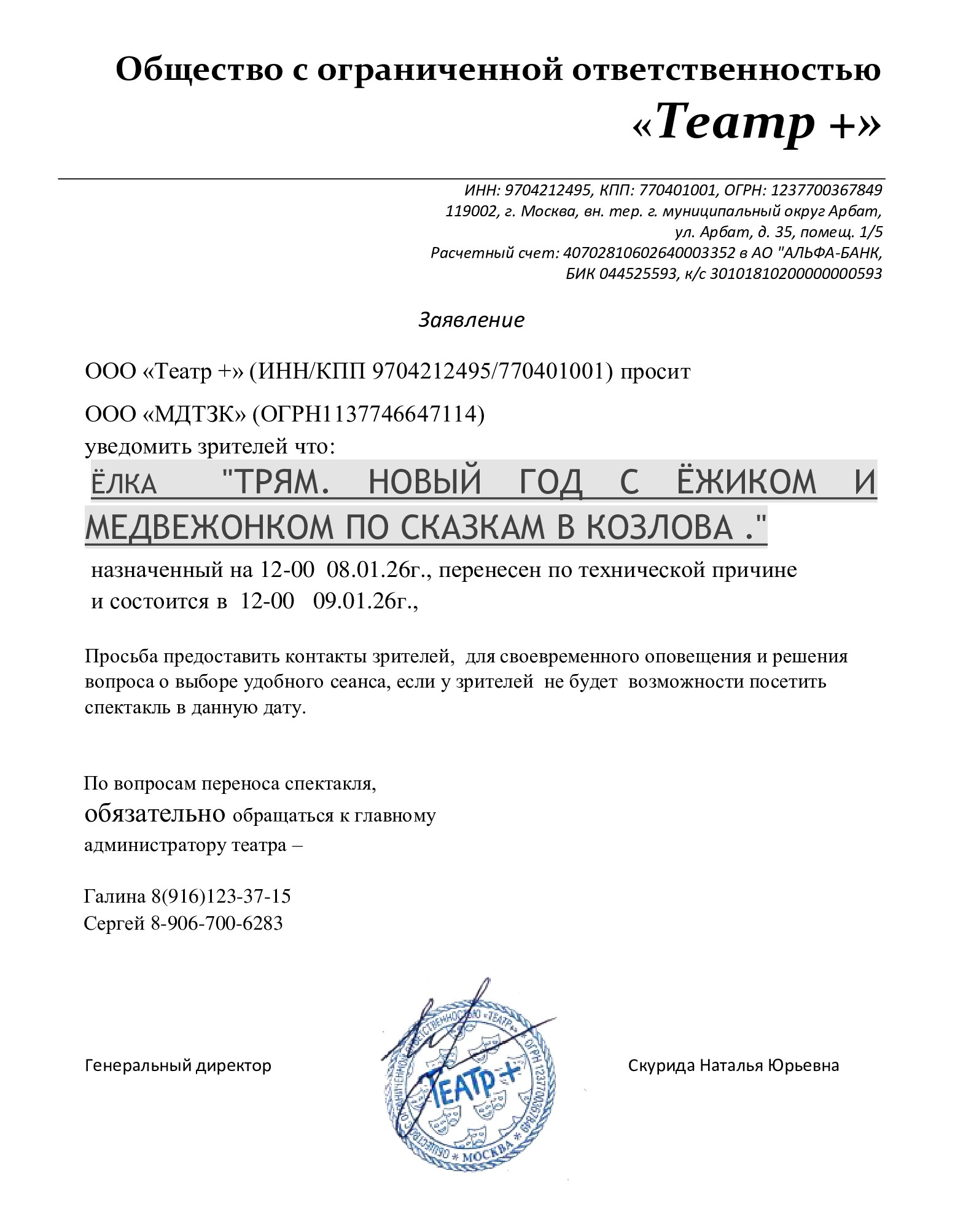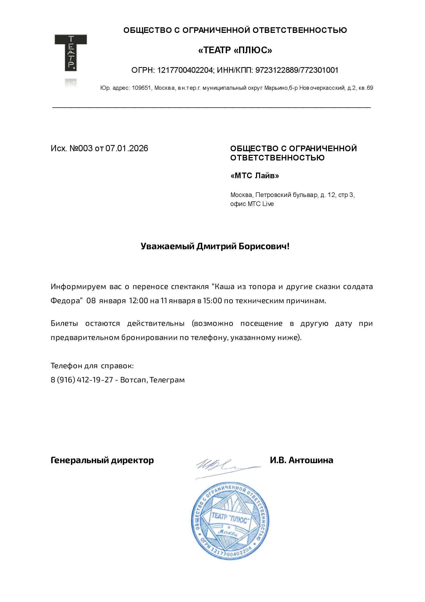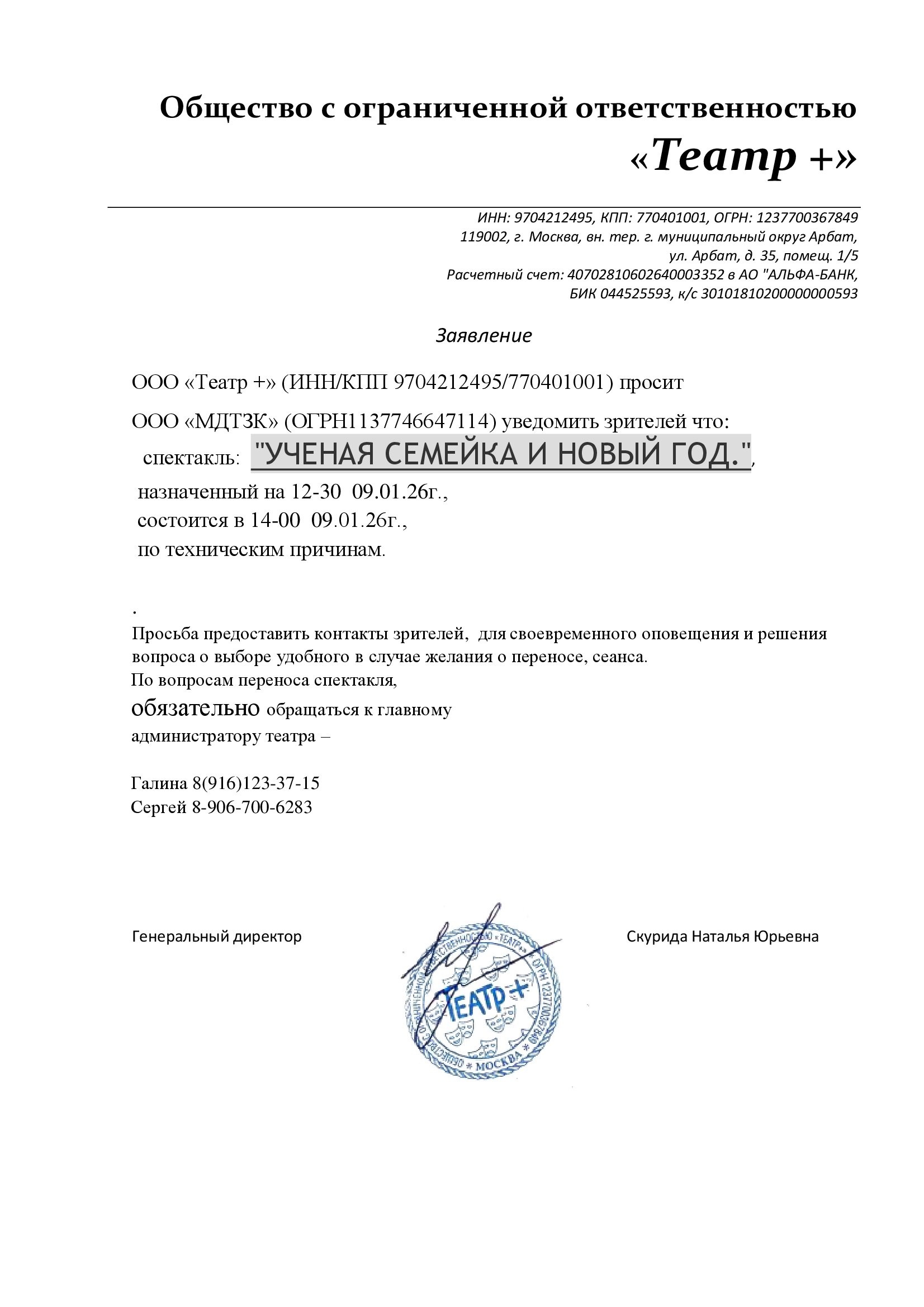 Уважаемый клиент! Спешим сообщить, что по информации, полученной от организатора, спектакль «Ученая семейка и Новый год», запланированный на 9 января 2026 года в 12:30 в Центральном Доме Актёра, перенесён на 14:00. Ранее приобретенные билеты действительны, обменивать их не нужно. По все вопросам обращайтесь, пожалуйста, к администратору театра — Галина 8 (916)123-37-15, Сергей 8 (906) 700-62-83 Письмо от организатораС уважением, команда поддержки Ticketland
