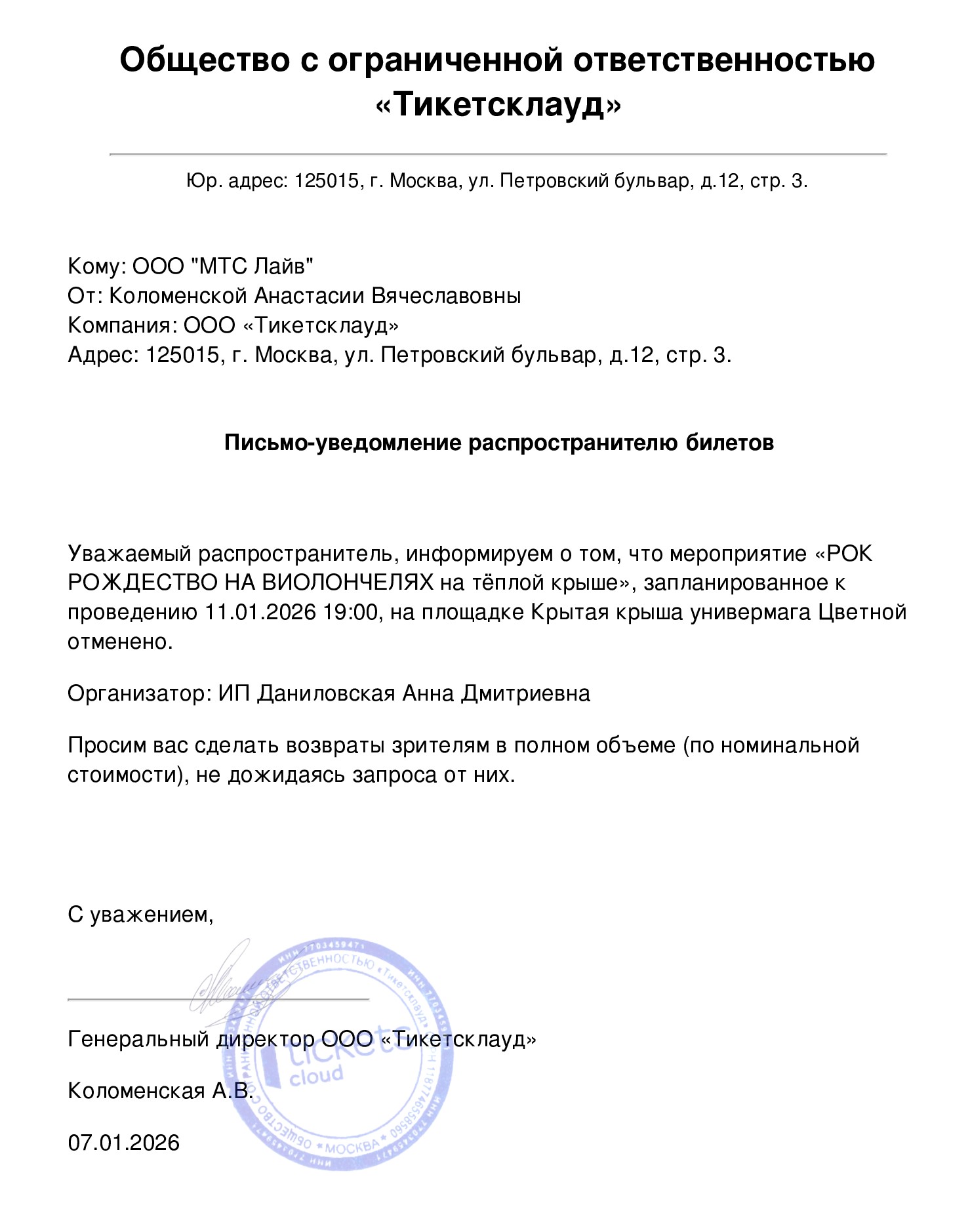 Уважаемый клиент! Спешим сообщить, что по информации, полученной от организатора, концерт «Arte Musicum. Рождество в Вене», запланированный на 7 января 2026 года в 19:00 в кинотеатре «Иллюзион», отменен. Организатор предлагает обменять билет без доплат на ближайшие концерты в кинотеатре «Иллюзион». 5 января 2026 года в 19:00 «Новый год в Буэнос-Айресе» или на 6 января 2026 года в 19:00 «Новый год в Вене». Также возможен обмен без доплат на любой другой концерт из афиши Организатора. Альтернативно зритель может оформить сертификат на сумму билета сроком на 1 год для посещения любого концерта из афиши Организатора. По вопросам возвратов, пожалуйста, обращайтесь к Организатору мероприятия: WhatsApp: +74952121195, telegram: @artemusicum_zabota, email: support@artemusicum.com. С уважением, команда поддержки Ticketland