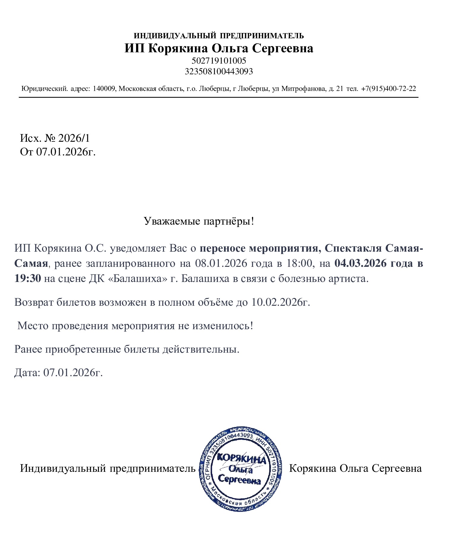Уважаемый клиент! Спешим сообщить, что по информации, полученной от организатора, спектакль «Самая – Самая», запланированный на 8 января 2026 года в 18:00 во Дворце культуры «Балашиха», перенесён на 4 марта 2026 года, начало в 19:30. Ранее приобретенные билеты действительны на новую дату, обменивать их не нужно. Если вам не удобно посетить спектакль в новую дату, вы можете вернуть билет по кнопке в личном кабинете во вкладке «Заказы» (до 9 марта 2026 года включительно). Деньги за электронные билеты вернутся автоматически в полном объёме на карту, с которой была произведена оплата. Если вы купили билет в кассе Ticketland.ru за наличный расчет, то обратитесь, пожалуйста, на почту: vozvrat@ticketland.ru. С уважением, команда поддержки Ticketland.