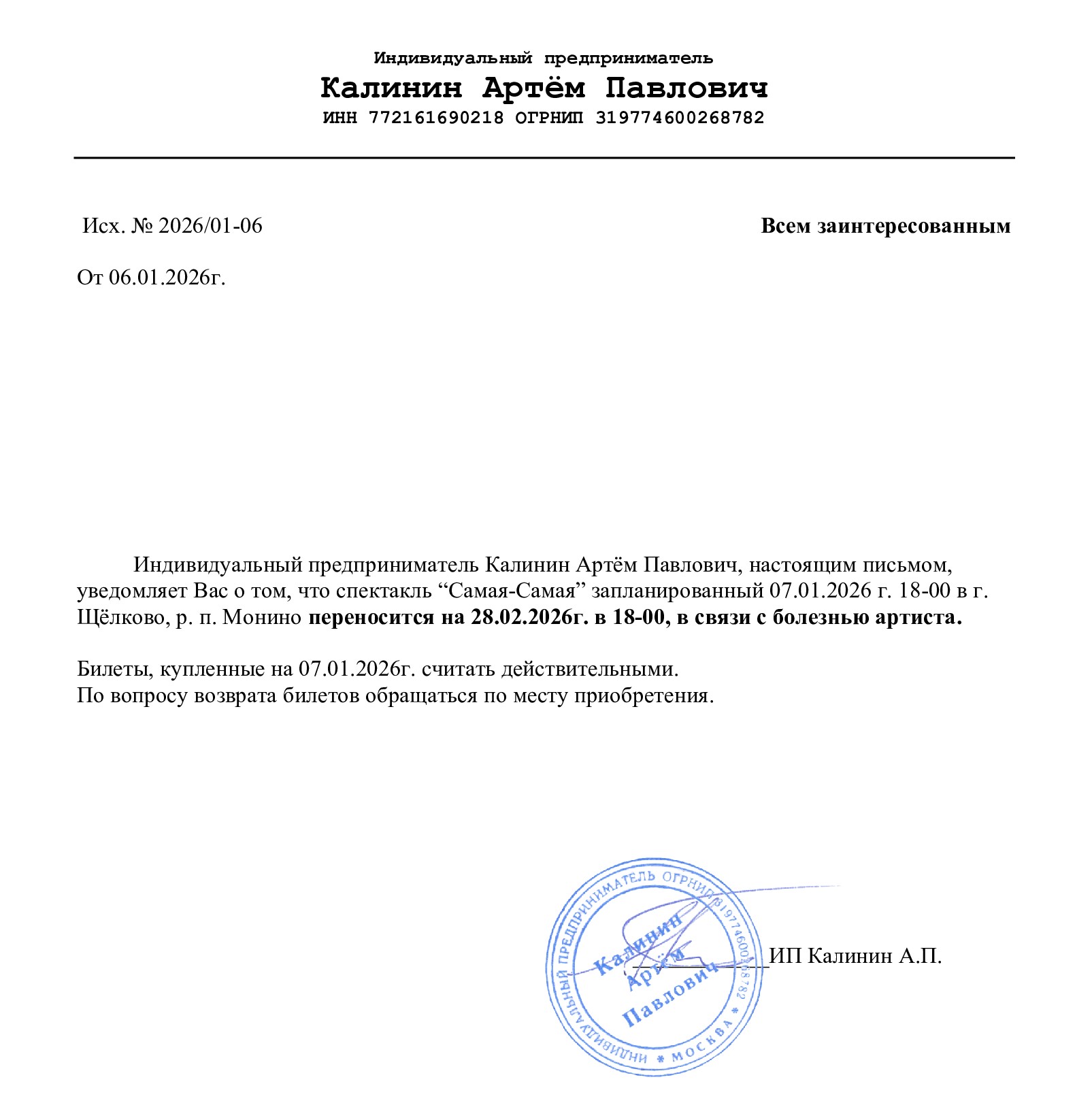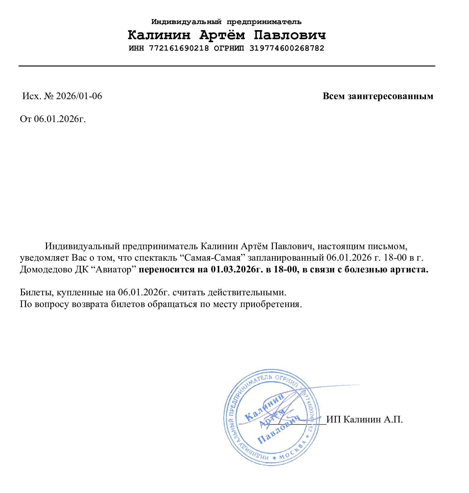 Уважаемый клиент! Спешим сообщить, что по информации, полученной от организатора, сольный концерт Ислама Итляшева с программой - ОНА ЛЮБИЛА РОЗЫ», запланированный на 20 февраля 2025 года в Липецк КРК Мегаполис, перенесен на открытую дату в связи с болезнью артиста.. Новая дата будет объявлена дополнительно. Ранее приобретенные билеты действительны на новую дату, обменивать их не нужно. Если вам не удобно посетить мероприятие в новую дату, вы можете вернуть билет по кнопке в личном кабинете во вкладке «Заказы». Деньги за электронные билеты вернутся автоматически в полном объёме на карту, с которой была произведена оплата. Если вы купили билет в кассе Ticketland.ru за наличный расчет, то обратитесь, пожалуйста, на почту: vozvrat@ticketland.ru. С уважением, команда поддержки Ticketland.
