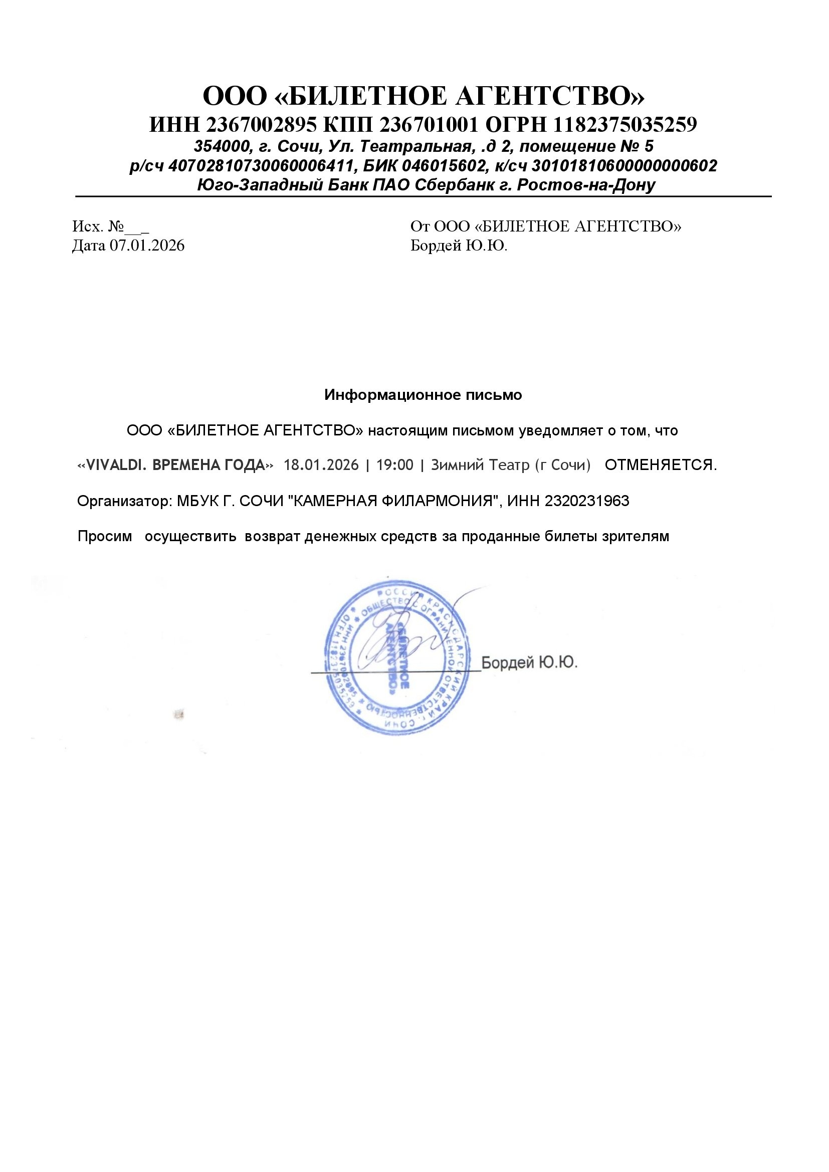 Уважаемый клиент! Спешим сообщить, что по информации, полученной от организатора, концерт «Vivaldi. Времена Года», запланированный на 18 января 2026 года в 19:00 в Зимнем театре, отменён. Деньги за электронные билеты вернутся автоматически в полном объёме на карту, с которой была произведена оплата. Если вы купили билет в кассе Ticketland.ru за наличный расчет, то обратитесь, пожалуйста, на почту: vozvrat@ticketland.ru. Письмо от организатораС уважением, команда поддержки Ticketland