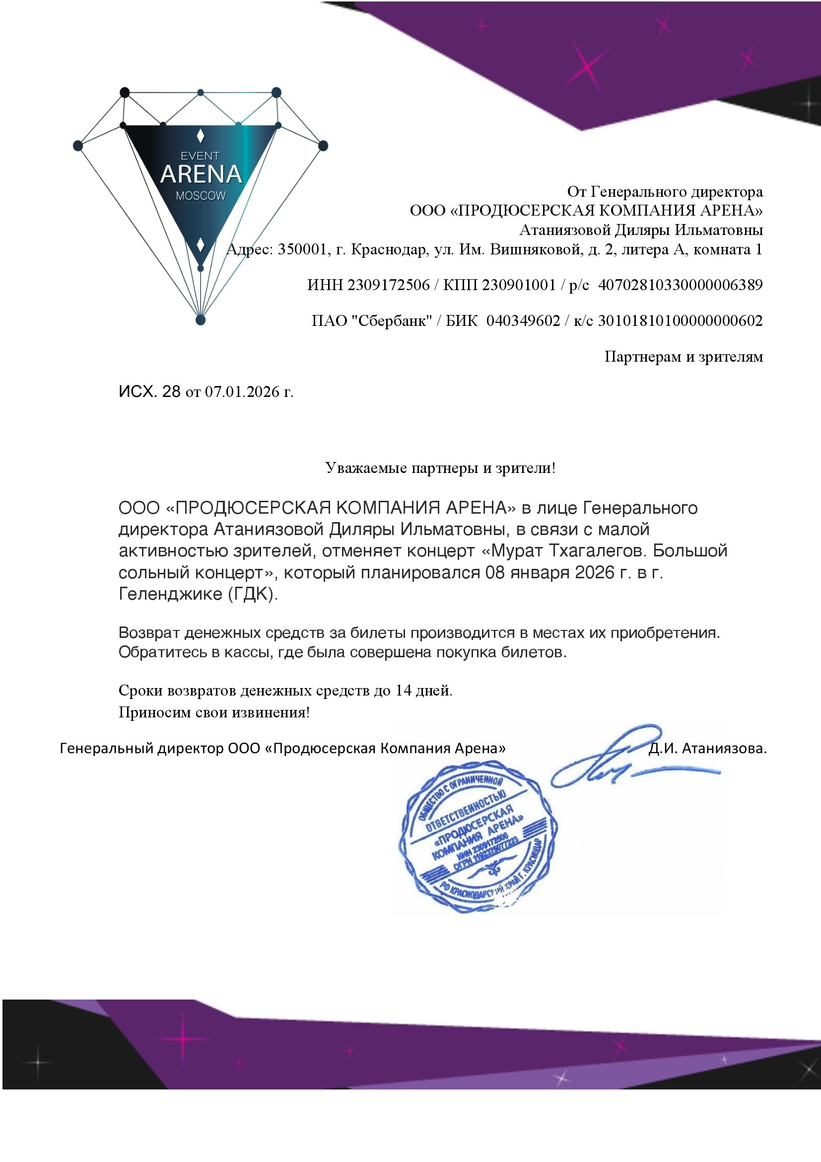 Уважаемый клиент! Спешим сообщить, что по информации, полученной от организатора, большой сольный концерт Мурата Тхагалегова, запланированный на 8 января 2026 года в 18:00 в дворце культуры города-курорта Геленджик, отменён. Деньги за электронные билеты вернутся автоматически в полном объёме на карту, с которой была произведена оплата. Если вы купили билет в кассе Ticketland.ru за наличный расчет, то обратитесь, пожалуйста, на почту: vozvrat@ticketland.ru. Письмо от организатораС уважением, команда поддержки Ticketland