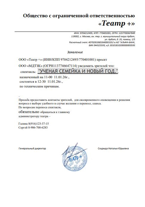 Уважаемый клиент! Спешим сообщить, что по информации, полученной от организатора, спектакль «Ученая семейка и Новый год», запланированный на 11 января 2026 года в 11:00 в «Центральном Доме Актёра», переносится по времени на 12:30 по техническим причинам. Ранее приобретенные билеты действительны, обменивать их не нужно. По вопросам переноса спектакля, обязательно обращаться к главному администратору театра — Галина 8(916)123-37-15 Сергей 8-906-700-6283 С уважением, команда поддержки Ticketland