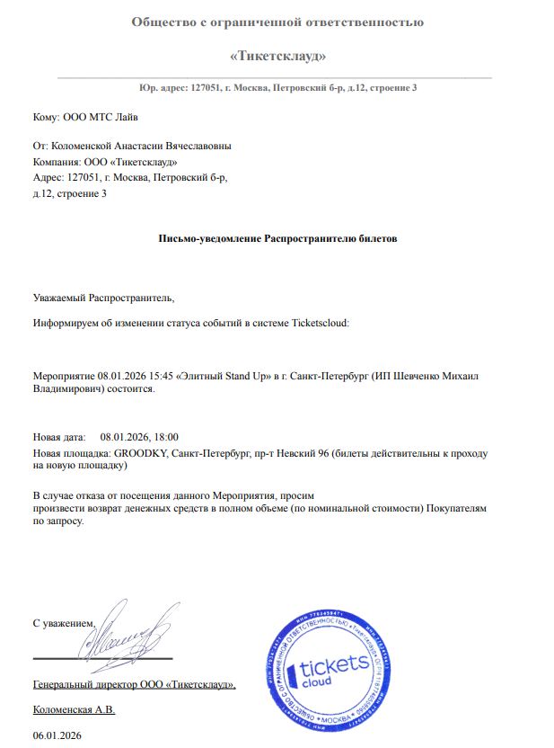 Уважаемый клиент! Спешим сообщить, что по информации, полученной от организатора, концерт «Элитный Stand Up», запланированный на 8 января 2026 года в 15:45 в ресторане «Квартира 8», перенесен на новую площадку: GROODKY, Санкт-Петербург, пр-т Невский 96, начало в 18:00 Ранее приобретенные билеты действительны на новую площадку, обменивать их не нужно. Если вам не удобно посетить мероприятие, вы можете вернуть билет по кнопке в личном кабинете во вкладке «Заказы». Деньги за электронные билеты вернутся автоматически в полном объёме на карту, с которой была произведена оплата. Если вы купили билет в кассе Ticketland.ru за наличный расчет, то обратитесь, пожалуйста, на почту: vozvrat@ticketland.ru. С уважением, команда поддержки Ticketland