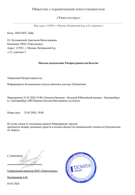 Уважаемый клиент! Спешим сообщить, что по информации, полученной от организатора, большой юбилейный концерт Татьяны Овсиенко, запланированный на 21 января 2026 года в 19:00 во дворце культуры железнодорожников (Екатеринбург), перенесен на 21 мая 2026 года, начало в 19:00. Ранее приобретенные билеты действительны на новую дату, обменивать их не нужно. Если вам не удобно посетить мероприятие в новую дату, вы можете вернуть билет по кнопке в личном кабинете во вкладке «Заказы». Деньги за электронные билеты вернутся автоматически в полном объёме на карту, с которой была произведена оплата. Если вы купили билет в кассе Ticketland.ru за наличный расчет, то обратитесь, пожалуйста, на почту: vozvrat@ticketland.ru. С уважением, команда поддержки Ticketland