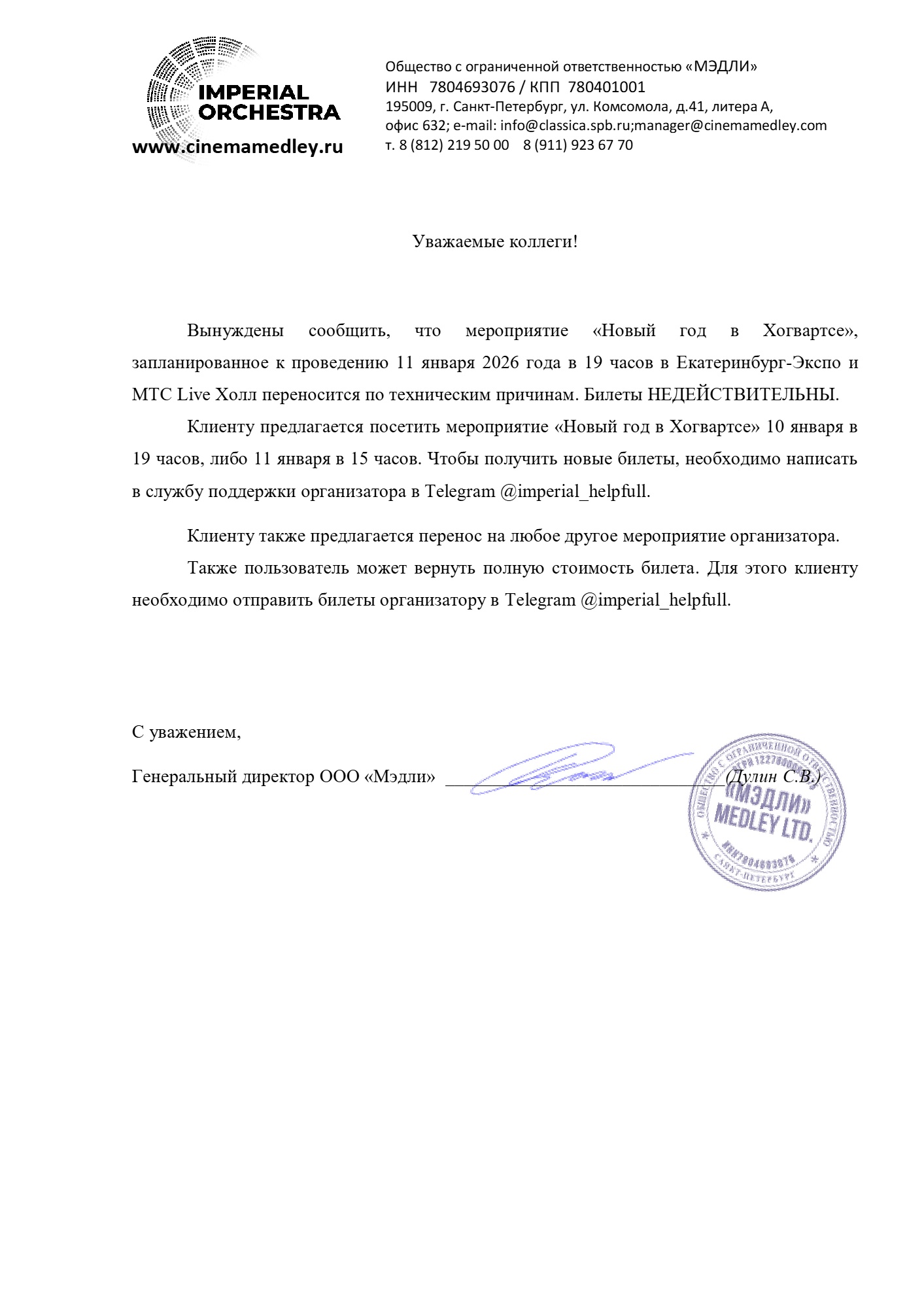 Уважаемый клиент! Спешим сообщить, что по информации, полученной от организатора, шоу «Новый год в Хогвартсе», запланированное на 11 января 2026 года в 19:00 в МТС Live Холле (Екатеринбург), переносится по техническим причинам. Ранее приобретенные билеты недействительны. Организатор предлагает посетить мероприятие «Новый год в Хогвартсе» 10 января в 19 часов, либо 11 января в 15 часов. Чтобы получить новые билеты, необходимо написать в службу поддержки организатора в Telegram @imperial_helpfull. По всем другим вопросам вы также можете обратиться по указанному ранее контакту. Более подробная информация содержится в письме от организатора ниже. С уважением, команда поддержки Ticketland.