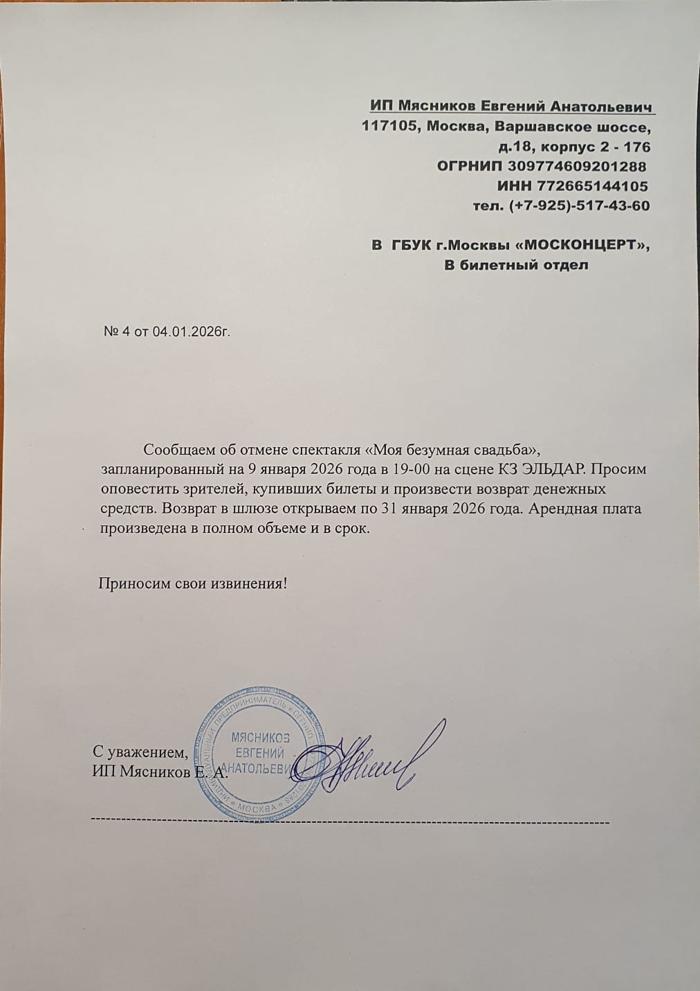 Уважаемый клиент! Спешим сообщить, что по информации, полученной от организатора, спектакль «Моя безумная свадьба», запланированный на 2026-01-09 в 19:00 в Киноконцертном зале «Эльдар», отменён. Деньги за электронные билеты вернутся автоматически в полном объёме на карту, с которой была произведена оплата. Если вы купили билет в кассе Ticketland.ru за наличный расчет, то обратитесь, пожалуйста, на почту: vozvrat@ticketland.ru. С уважением, команда поддержки Ticketland