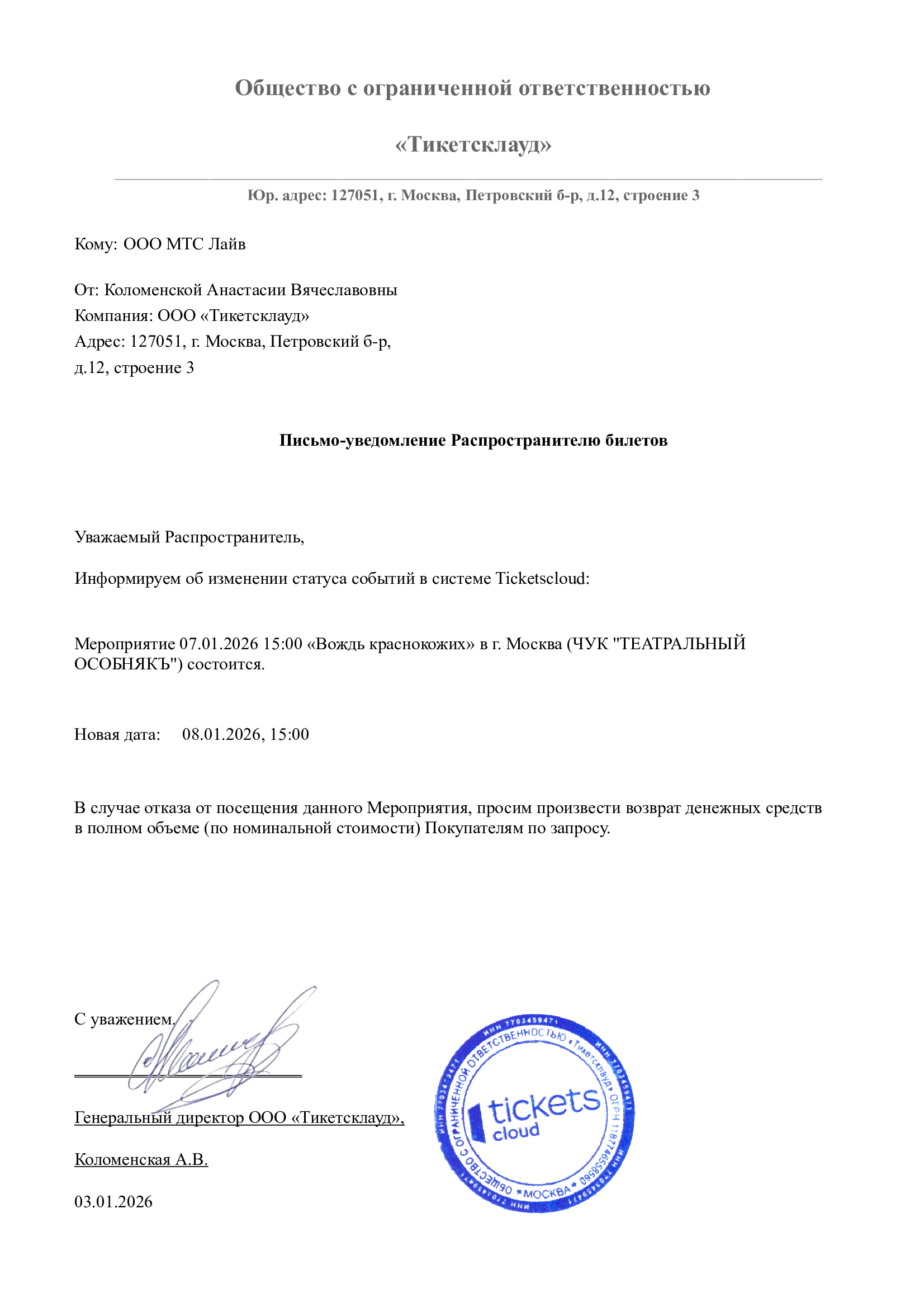 Уважаемый клиент! Спешим сообщить, что по информации, полученной от организатора, спектакль «Вождь краснокожих», запланированный на 7 января 2026 года в 15:00 в Театральном особняке, перенесён на 8 января 2026 года, начало в 15:00. Ранее приобретенные билеты действительны на новую дату, обменивать их не нужно. Если вам не удобно посетить спектакль в новую дату, вы можете вернуть билет по кнопке в личном кабинете во вкладке «Заказы». Деньги за электронные билеты вернутся автоматически в полном объёме на карту, с которой была произведена оплата. Если вы купили билет в кассе Ticketland.ru за наличный расчет, то обратитесь, пожалуйста, на почту: vozvrat@ticketland.ru. С уважением, команда поддержки Ticketland.