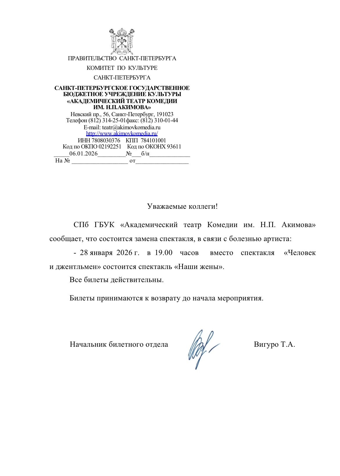 Уважаемый клиент! Спешим сообщить, что по информации, полученной от организатора, спектакль «Человек и джентльмен», запланированный на 28 января 2026 года в 19:00 в театре комедии им. Акимова, заменён на спектакль «Наши жены», начало в 19:00. Ранее приобретенные билеты действительны, обменивать их не нужно. Если вы не хотите посетить новое мероприятие, вернуть билет можно по кнопке в личном кабинете во вкладке «Заказы». Деньги за электронные билеты вернутся автоматически в полном объёме на карту, с которой была произведена оплата. Если вы купили билет в кассе Ticketland.ru за наличный расчет, то обратитесь, пожалуйста, на почту: vozvrat@ticketland.ru. С уважением, команда поддержки Ticketland
