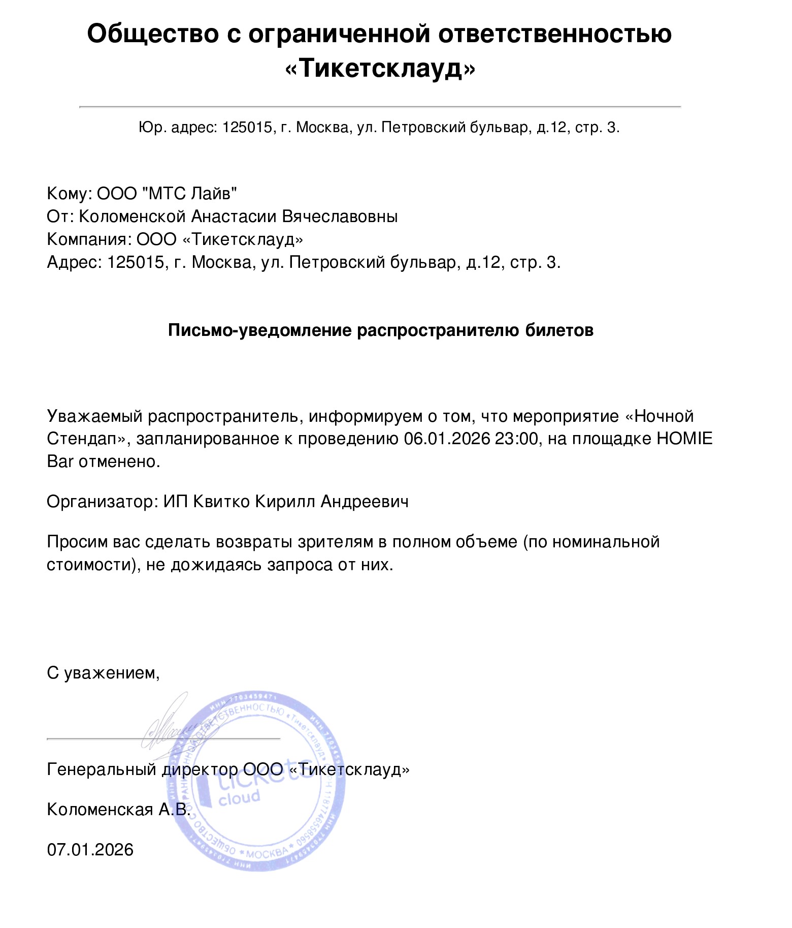 Уважаемый клиент! Спешим сообщить, что по информации, полученной от организатора, Ночной стендап, запланированный на 6 января 2026 года в 23:00 в Homie Bar, отменён. Деньги за электронные билеты вернутся автоматически в полном объёме на карту, с которой была произведена оплата. Если вы купили билет в кассе Ticketland.ru за наличный расчет, то обратитесь, пожалуйста, на почту: vozvrat@ticketland.ru. С уважением, команда поддержки Ticketland.