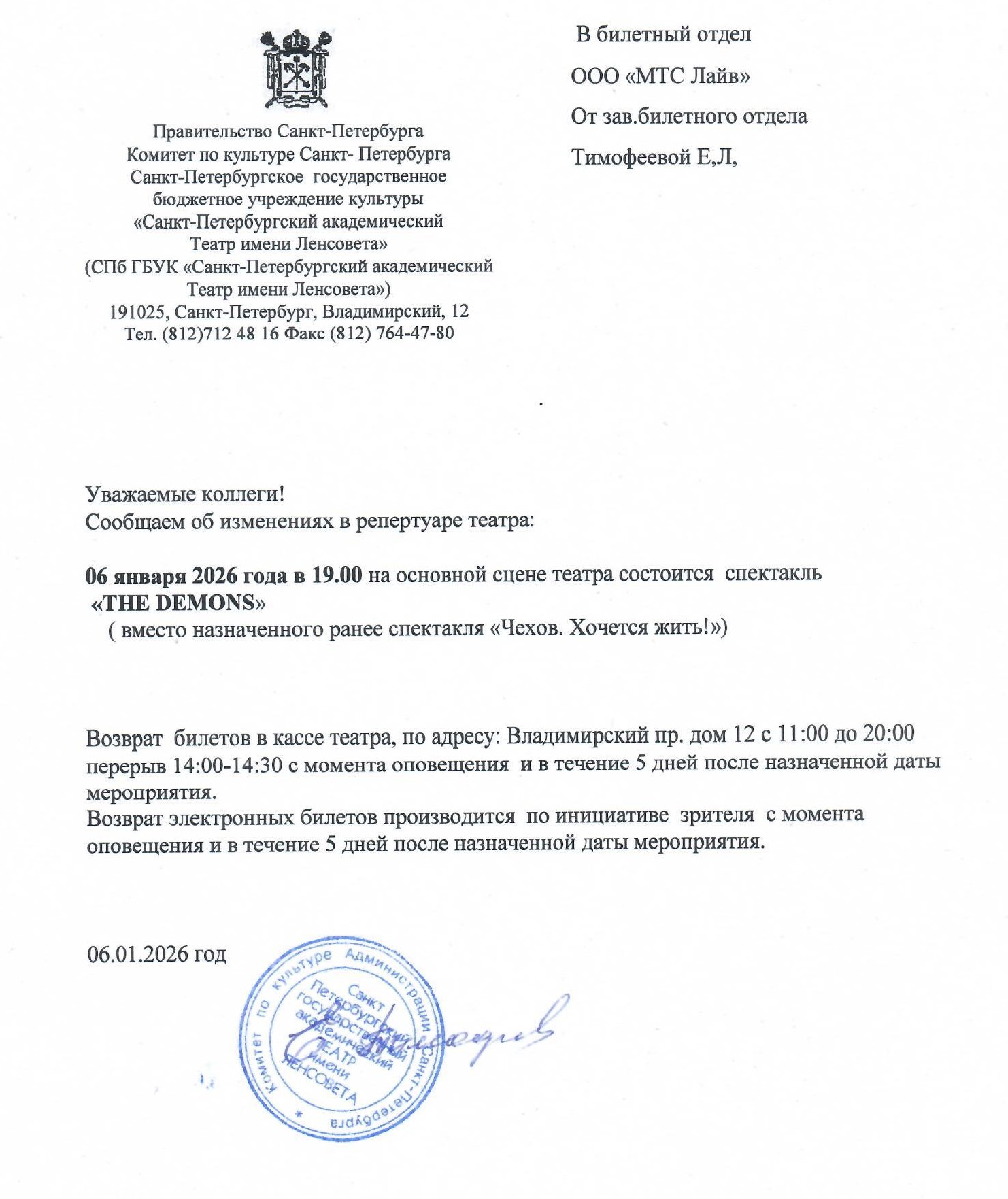 Уважаемый клиент! Спешим сообщить, что по информации, полученной от организатора, спектакль «Чехов. Хочется жить!», запланированный на 6 января 2026 года в 19:00 в Театре имени Ленсовета, заменён на спектакль «THE DEMONS». Ранее приобретенные билеты действительны на новый спектакль, обменивать их не нужно. Если новый спектакль вам не подходит, вы можете вернуть билет по кнопке в личном кабинете во вкладке «Заказы». Деньги за электронные билеты вернутся автоматически в полном объёме на карту, с которой была произведена оплата. Если вы купили билет в кассе Ticketland.ru за наличный расчет, то обратитесь, пожалуйста, на почту: vozvrat@ticketland.ru. С уважением, команда поддержки Ticketland.