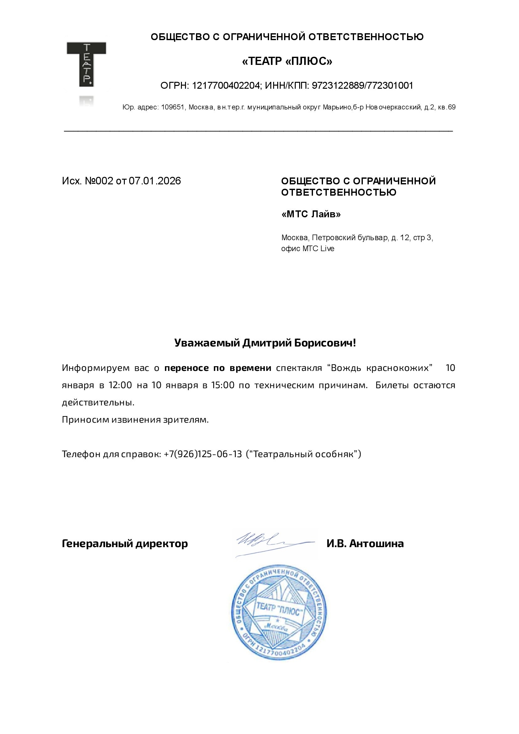 Уважаемый клиент! Спешим сообщить, что по информации, полученной от организатора, спектакль «Вождь краснокожих», запланированный на 10 января 2026 года в 12:00 в театральном особняке, перенесён на 15:00. Ранее приобретенные билеты действительны, обменивать их не нужно. По все вопросам обращайтесь, пожалуйста, к организатору по телефону: +7 (926) 125-06-13 (Театральный особняк) Театральный особнякС уважением, команда поддержки Ticketland