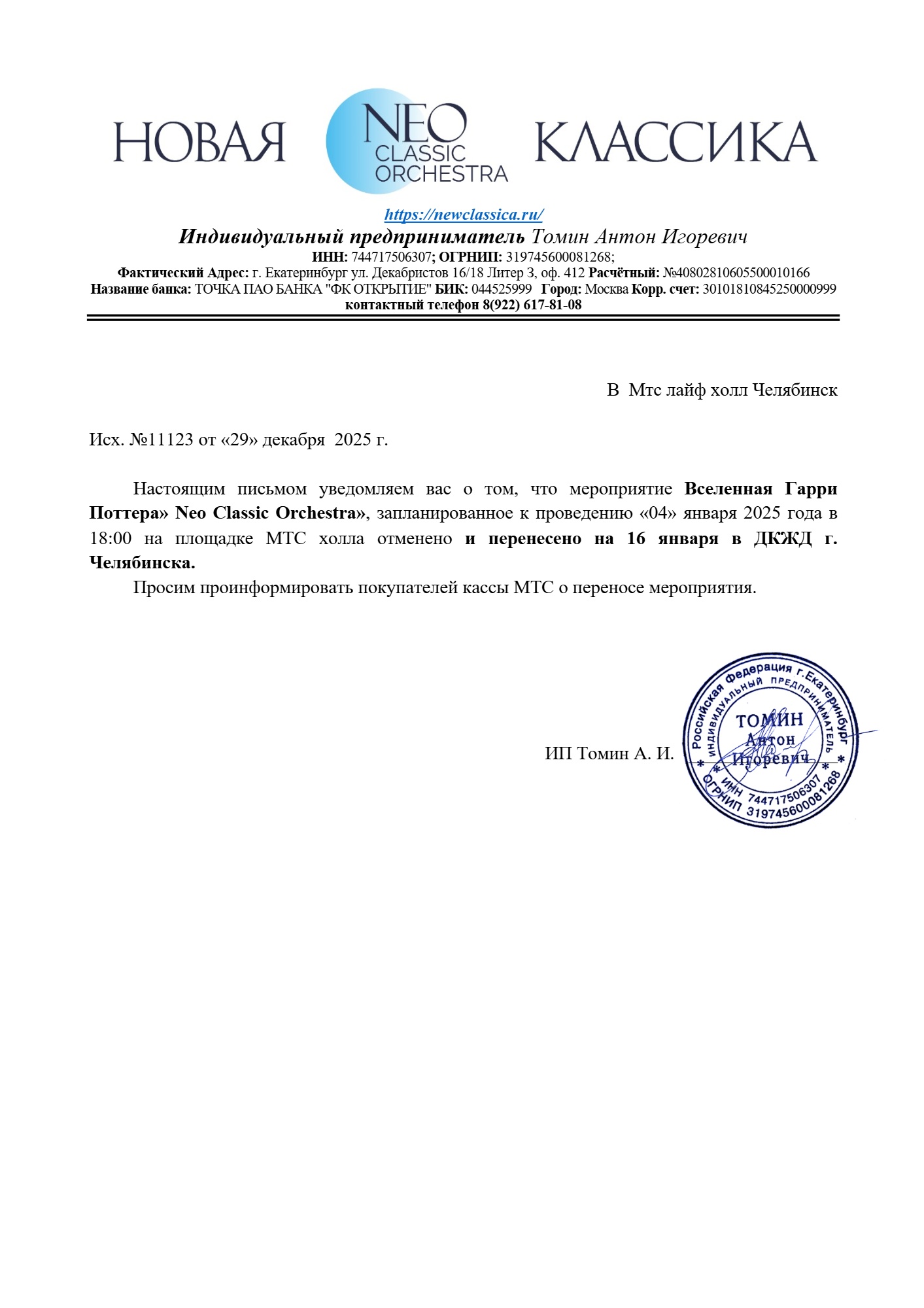 Уважаемый клиент! Спешим сообщить, что по информации, полученной от организатора, концерт Neo Classic Orchestra «Вселенная Гарри Поттера. «Магия свечей», запланированный на 4 января в 18:00 в МТС Live Холл Челябинск, перенесён на 16 января 2026 года в ДКЖД г.Челябинска. Ранее приобретенные билеты действительны, обменивать их не нужно. Если вы не хотите посетить мероприятие, вернуть билет можно по кнопке в личном кабинете во вкладке «Заказы». Деньги за электронные билеты вернутся автоматически в полном объёме на карту, с которой была произведена оплата. Если вы купили билет в кассе Ticketland.ru за наличный расчет, то обратитесь, пожалуйста, на почту: vozvrat@ticketland.ru. С уважением, команда поддержки Ticketland.