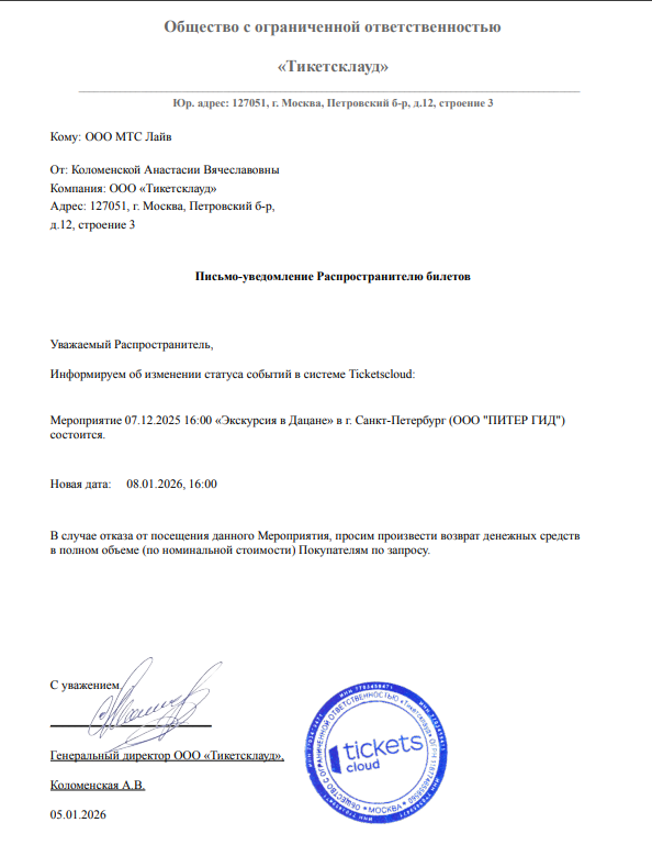 Уважаемый клиент! Спешим сообщить, что по информации, полученной от организатора, Экскурсия в Дацане, запланированная на 07.12.2025 в 16:00, перенесена на 08.01.2026 в 16:00. Ранее приобретенные билеты действительны на новую дату, обменивать их не нужно. Если вам не удобно посетить мероприятие в новую дату, вы можете вернуть билет по кнопке в личном кабинете во вкладке «Заказы». Деньги за электронные билеты вернутся автоматически в полном объёме на карту, с которой была произведена оплата. Если вы купили билет в кассе Ticketland.ru за наличный расчет, то обратитесь, пожалуйста, на почту: vozvrat@ticketland.ru. С уважением, команда поддержки Ticketland