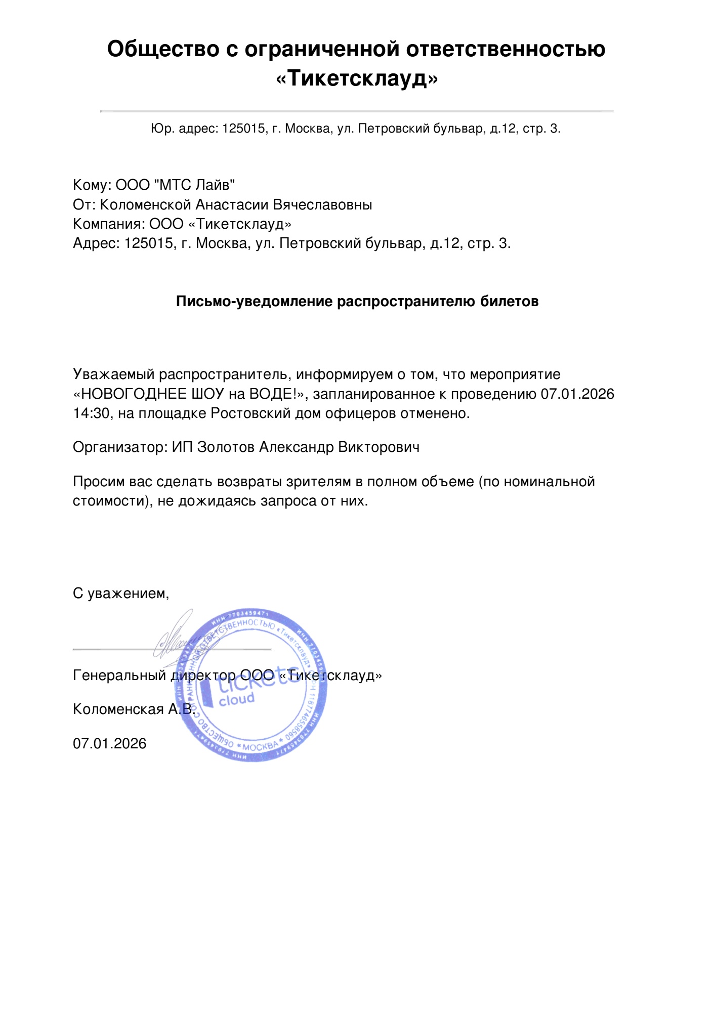 Уважаемый клиент! Спешим сообщить, что по информации, полученной от организатора, Новогоднее шоу на воде, запланированное на 7 января 2026 года в 14:30 в Доме офицеров Южного Военного округа, отменён. Деньги за электронные билеты вернутся автоматически в полном объёме на карту, с которой была произведена оплата. Если вы купили билет в кассе Ticketland.ru за наличный расчет, то обратитесь, пожалуйста, на почту: vozvrat@ticketland.ru. С уважением, команда поддержки Ticketland.
