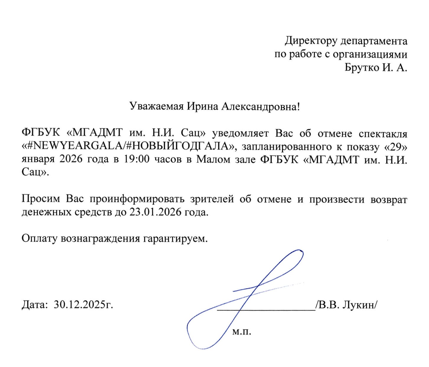 Уважаемый клиент! Спешим сообщить, что по информации, полученной от организатора, спектакль «#NEWYEARGALA / #НОВЫЙГОДГАЛА», запланированный на 29 января 2026 года в 19:00 в Детском театре им. Н. И. Сац, отменён. Деньги за электронные билеты вернутся автоматически в полном объёме на карту, с которой была произведена оплата. Если вы купили билет в кассе Ticketland.ru за наличный расчет, то обратитесь, пожалуйста, на почту: vozvrat@ticketland.ru. С уважением, команда поддержки Ticketland.